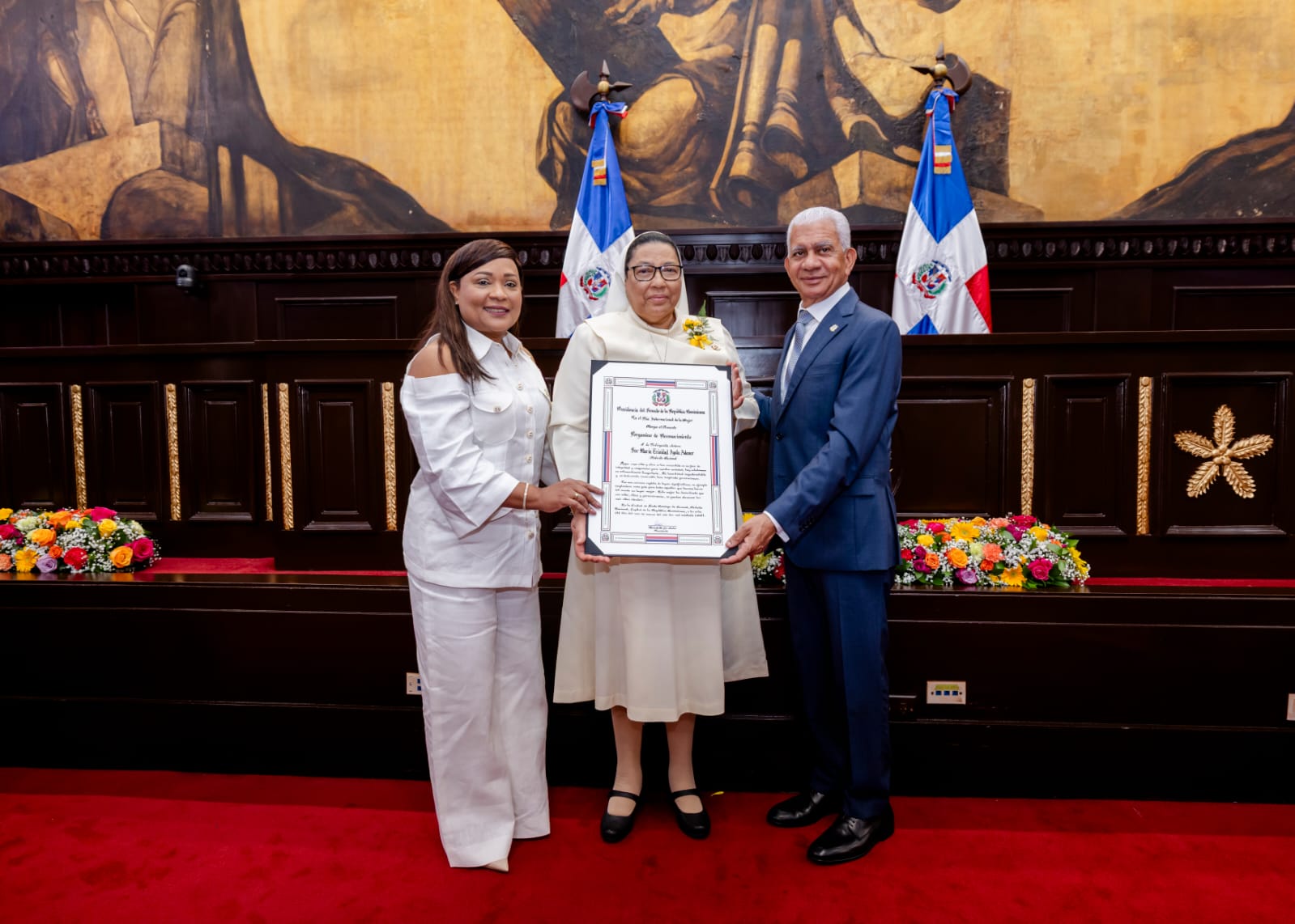 El solemne acto, celebrado en el salón de la Asamblea Nacional, estuvo encabezado por el presidente del Senado, Ricardo de los Santos, quien invistió a sor Ayala Adames en representación de las mujeres residentes en el Distrito Nacional con la entrega de un pergamino de reconocimiento. Su nominación fue presentada por el senador de esa demarcación, Omar Fernández.